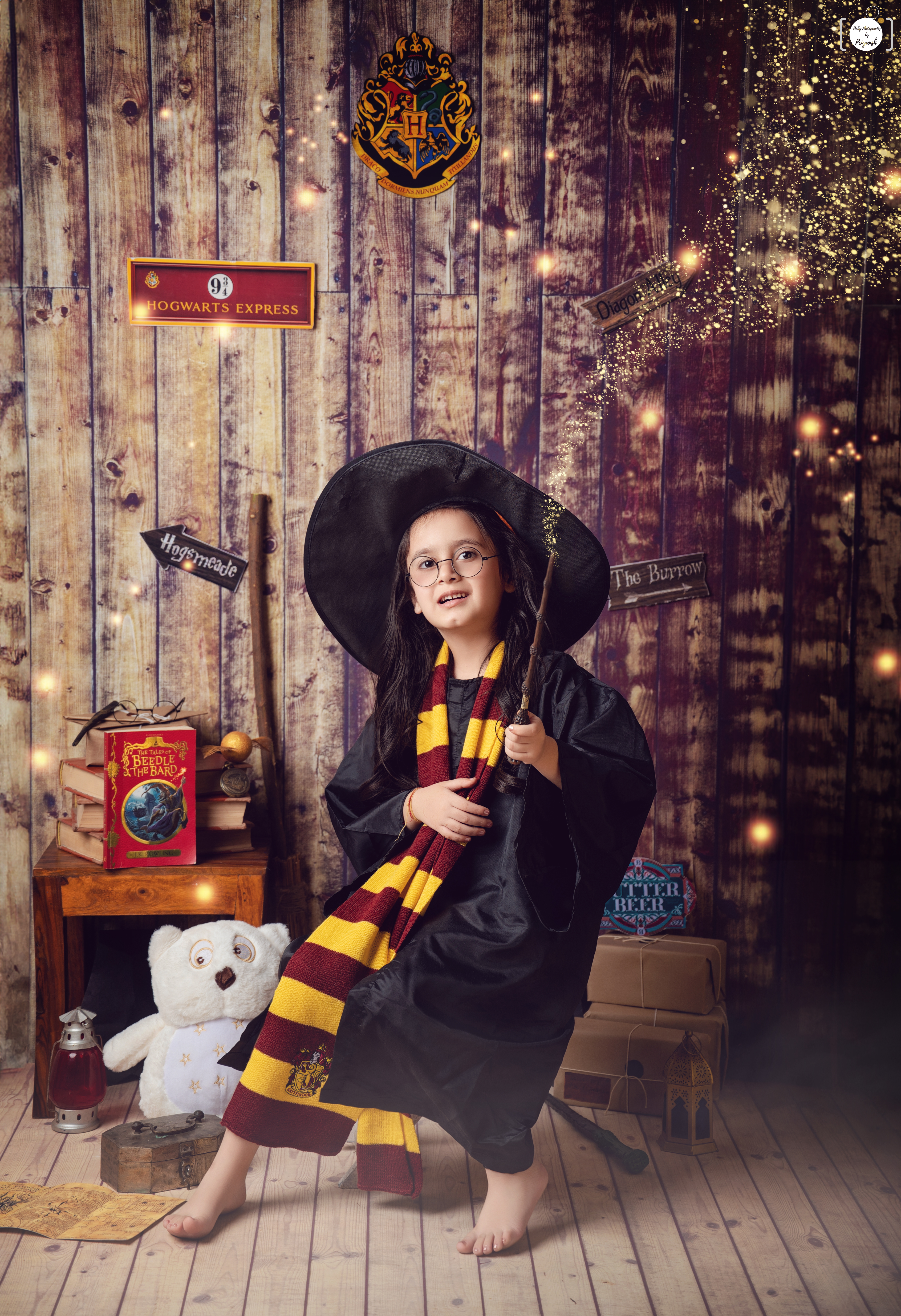 Little wizard girl in Harry Potter themed baby photoshoot, magical children's photography.