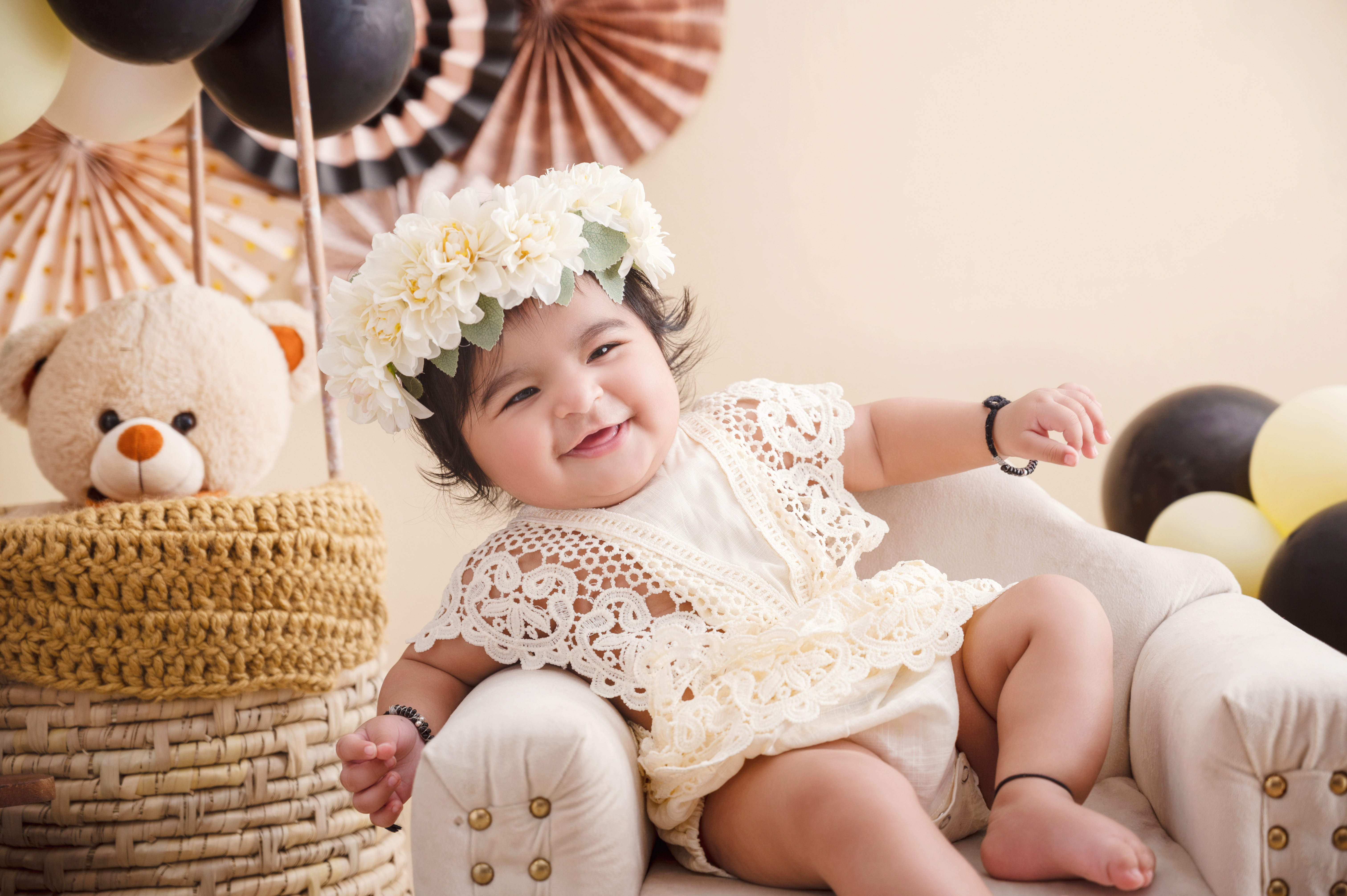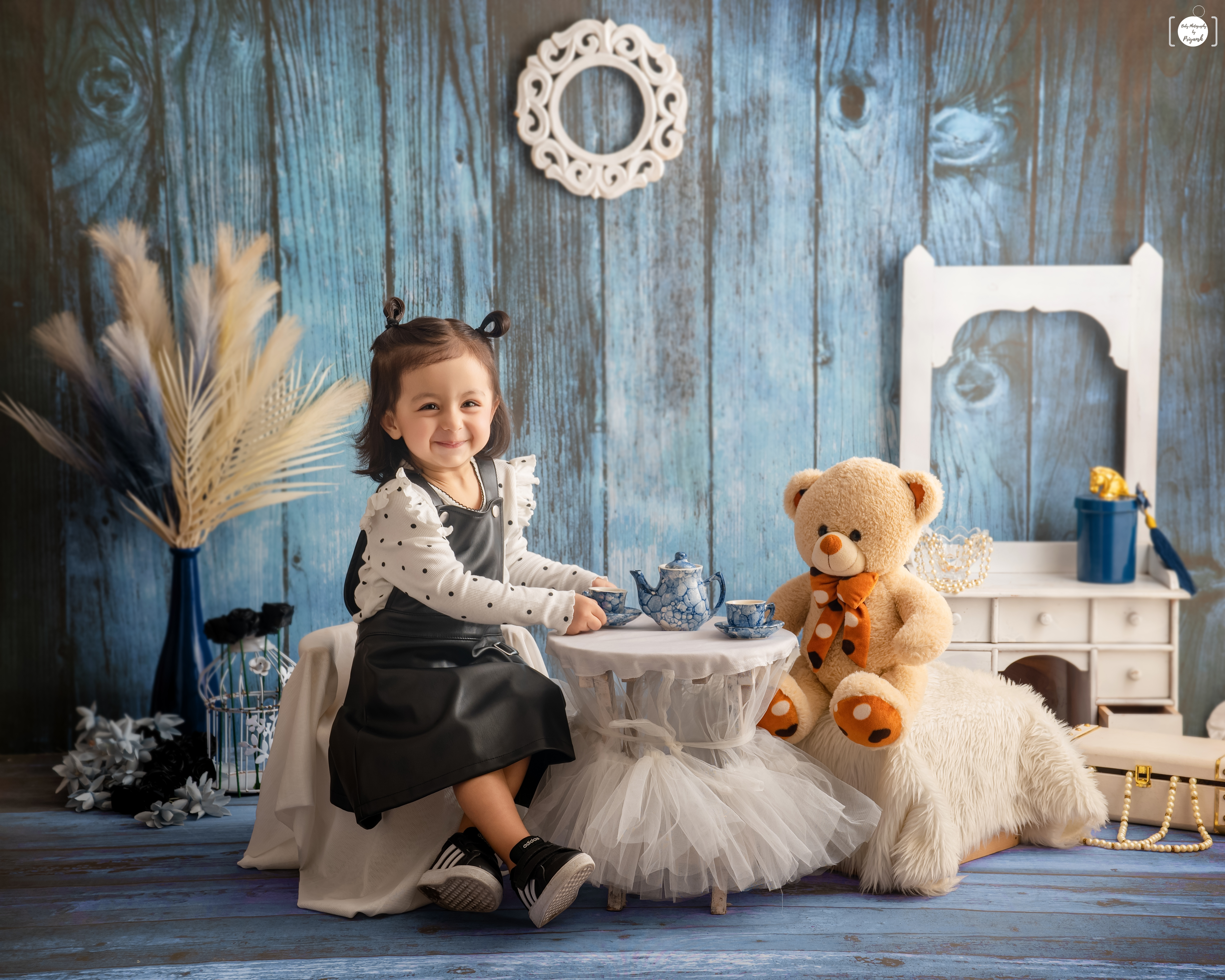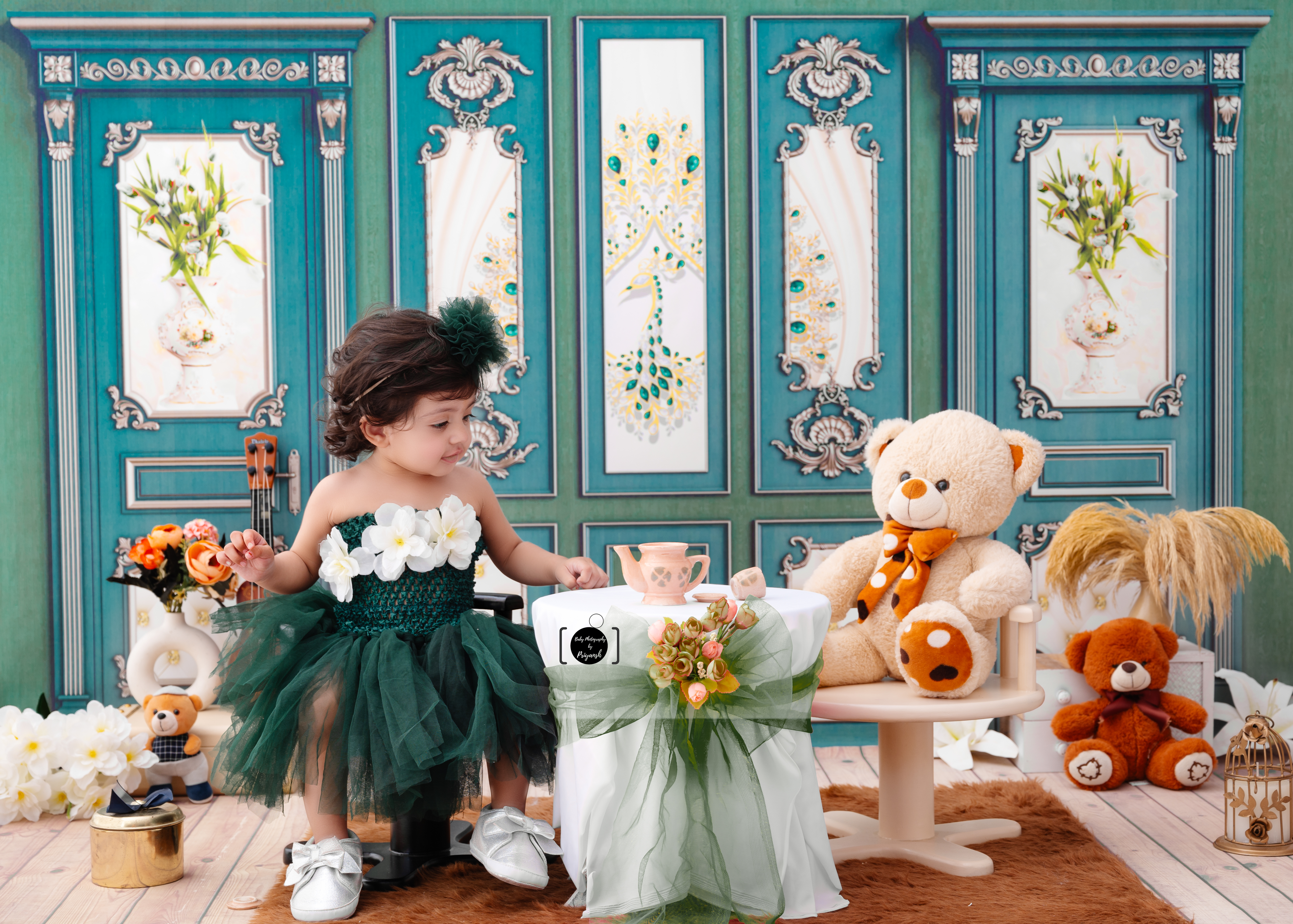 Tea party themed baby photoshoot, whimsical children's portrait, girl with teddy bear.