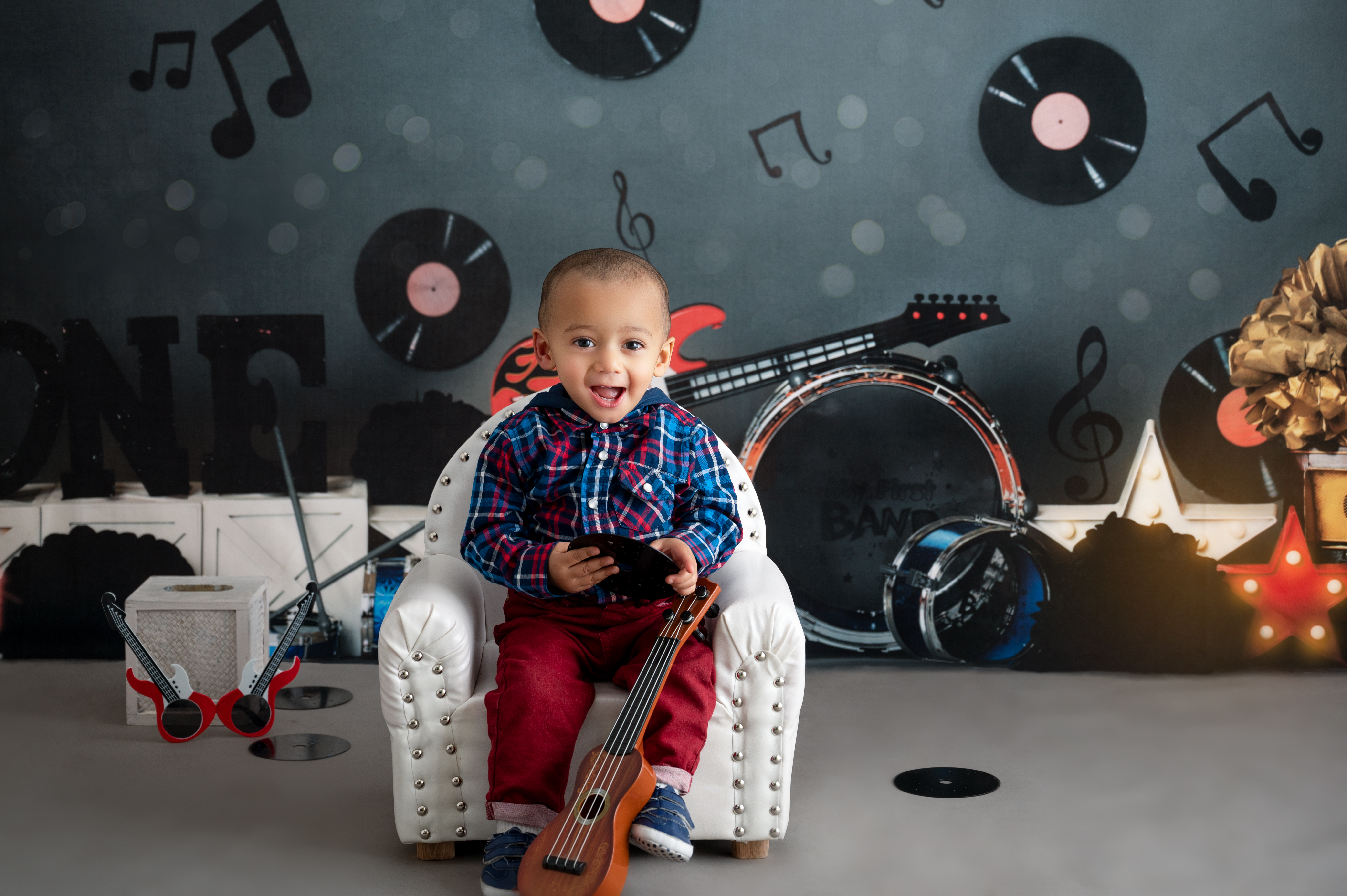 Musical themed first birthday photoshoot, baby boy with piano, cloud and music notes.