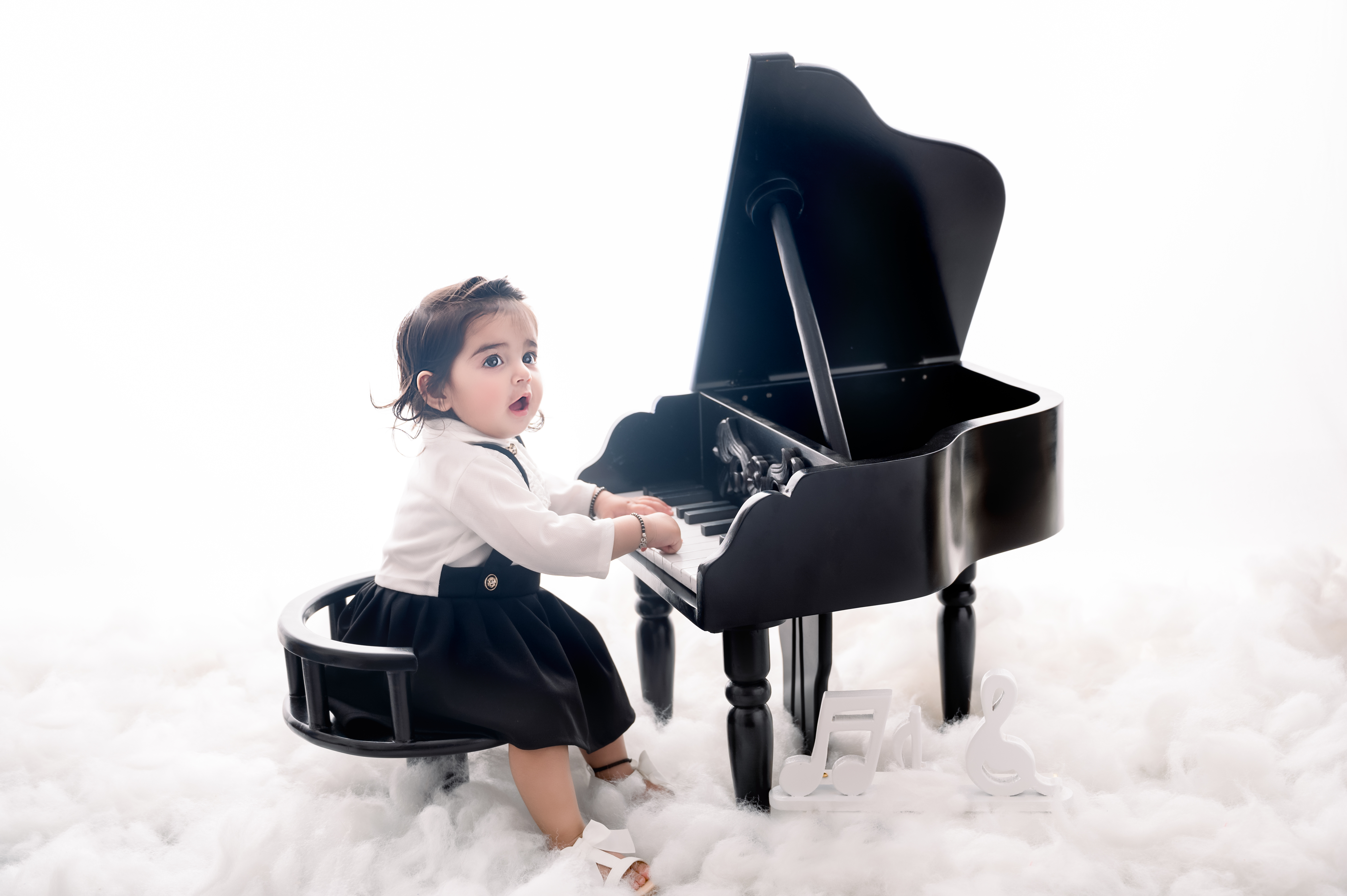Musical themed baby portrait, elegant baby photography, girl with piano.